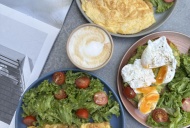 EGGS, bacon, cherry tomatoes, lollo salad, Ana bread, dressing
