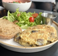 Eggs, mushrooms, cherry tomatoes, lollo salad, Ana bread, dressing