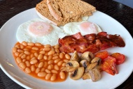 OUĂ ochi, fasole în sos de roșii, ciuperci sotate, roșie coaptă, bacon crocant, pâine Ana