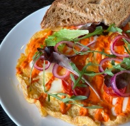 omelette with Lollo salad, cherry tomatoes, Ana bread, dressing
